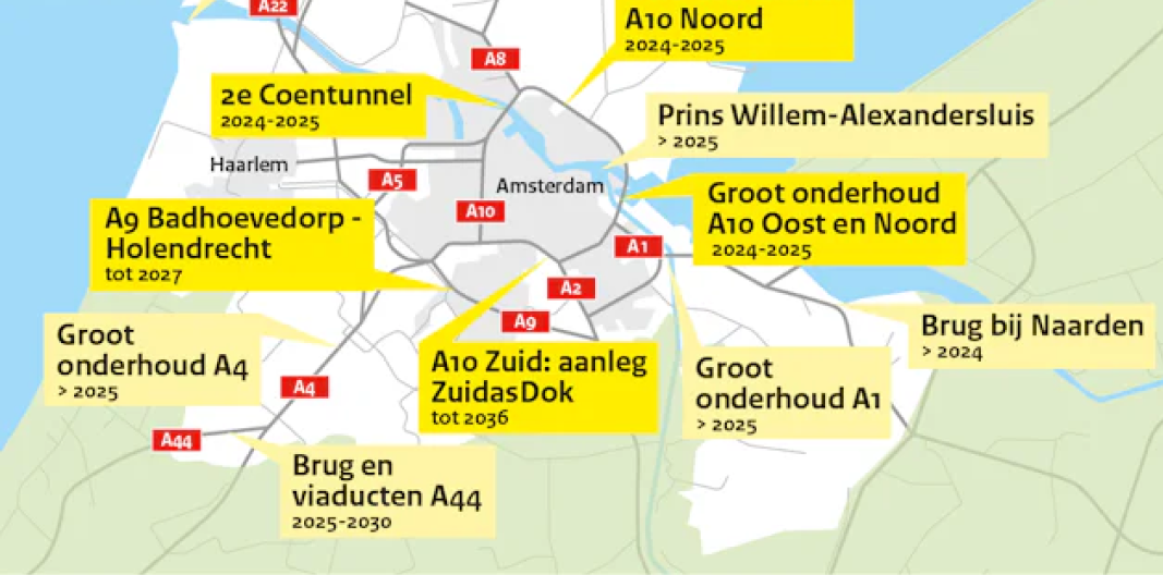 Rijkswaterstaat renoveert en vervangt in Noord-Holland de komende jaren veel infrastructuur, zoals bruggen en viaducten. Ook voeren we op verschillende wegen groot onderhoud uit.